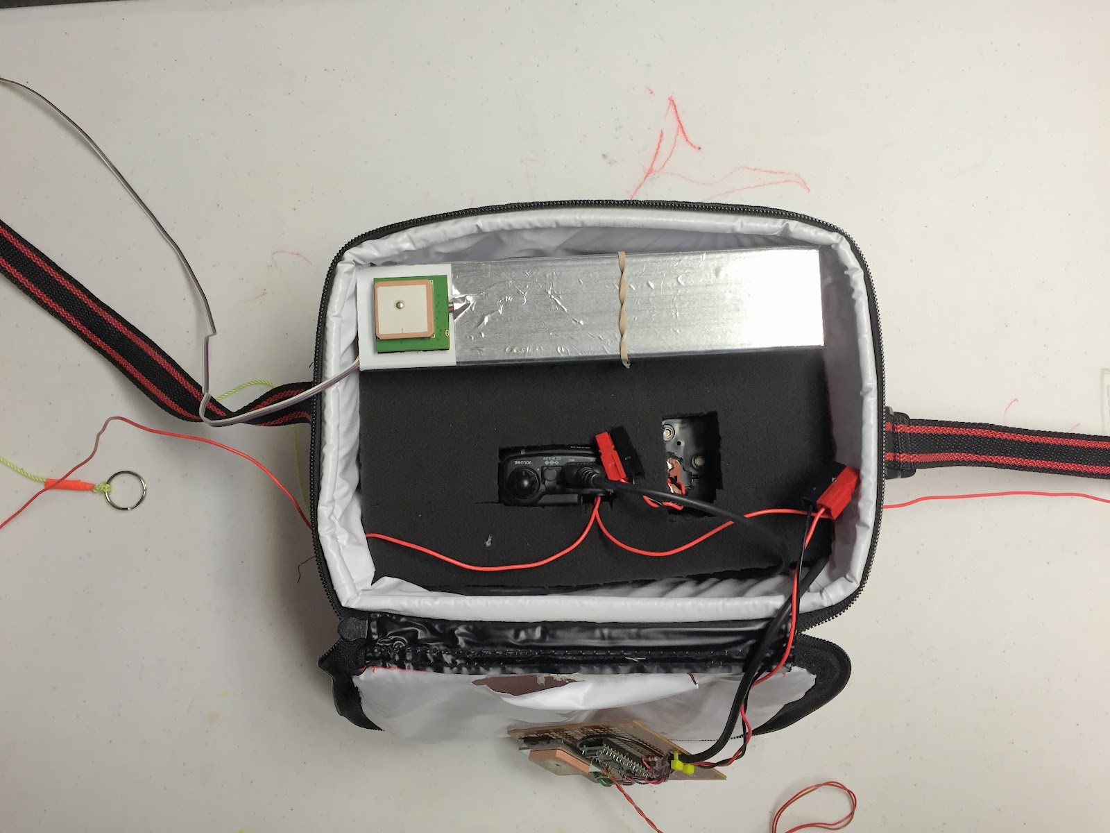 Alinco DJ-S11 2 meter transceiver and battery pack tucked away in foam. Top of the image is the data logger enclosure and its GPS module (upper left).